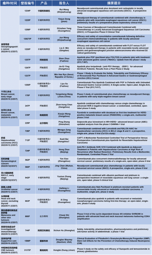 作为从事创新和高品质药物研发的国际化制药企业,AG百家乐官网医药的研究成果在2022 ESMO大会上还收获了25项壁报形式的报告。其中,食管胃癌领域共有9项研究入选,研究的方案主要是卡瑞利珠单抗或卡瑞利珠单抗联合阿帕替尼,通过与化疗或放化疗联用,新辅助治疗食管鳞癌或胃癌。2022年9月12日(CEST),让我们齐聚ESMO大会,共同领略食管胃癌研究领域的学术盛宴。此外,AG百家乐官网医药达尔西利、吡咯替尼、阿得贝利单抗等创新药还有4项乳腺癌研究、3项肝癌研究及其他领域的9项研究都将会以壁报展出,让我们共同期待!