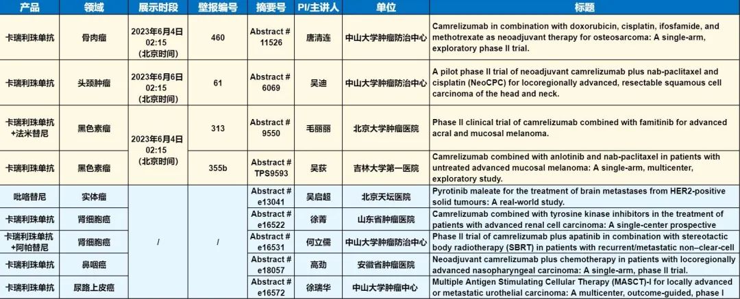 此外,在头颈肿瘤、黑色素瘤、骨肉瘤、鼻咽癌、肾细胞癌、尿路上皮癌等多个领域,卡瑞利珠单抗、吡咯替尼等产品相关研究一共入选了4项壁报展示和5项线上发表,彰显了AG百家乐官网医药强大的自主研发综合实力。