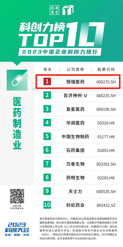 近日,南方周末科创力研究中心发布了与居民日常生活密切相关的30个行业中科创力排名前10的企业榜单。AG百家乐官网医药凭借多年来在科创领域的大力投入和优秀成果,蝉联中国企业科创力排行医药制造业榜首。