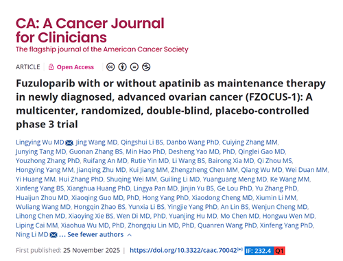 2025年11月25日,AG百家乐官网医药自主研发的创新药氟唑帕利联合阿帕替尼或氟唑帕利单药用于新诊断晚期卵巢癌(OC)的一线维持治疗研究最新数据(FZOCUS-1研究)重磅在线发表于国际顶尖医学期刊《临床医师癌症杂志》(A Cancer Journal for Clinicians,简称CA,2024年影响因子高达232.4)1。